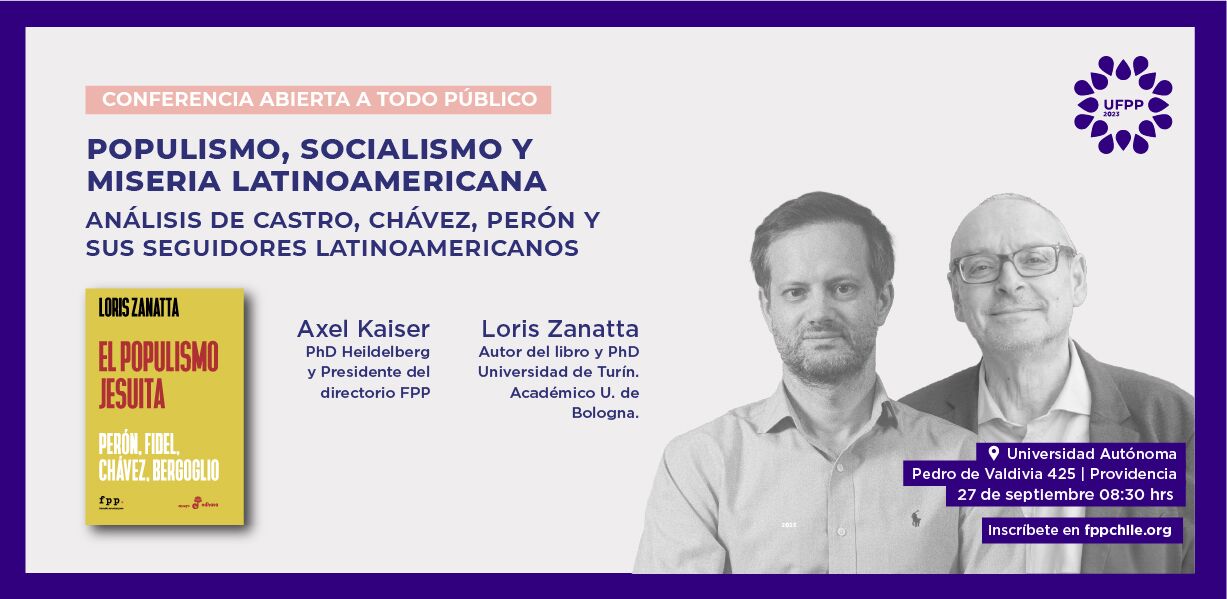 Fundación para el Progreso te invita al conversatorio entre el intelectual, escritor y PhD en Filosofía de la Universidad de Heilderberg, Axel Kaiser, y el destacado PhD en Historia y académico de la Universidad de Bolonia, Loris Zanatta. Esta conversación se realizará en el marco del lanzamiento del libro «El populismo jesuita».