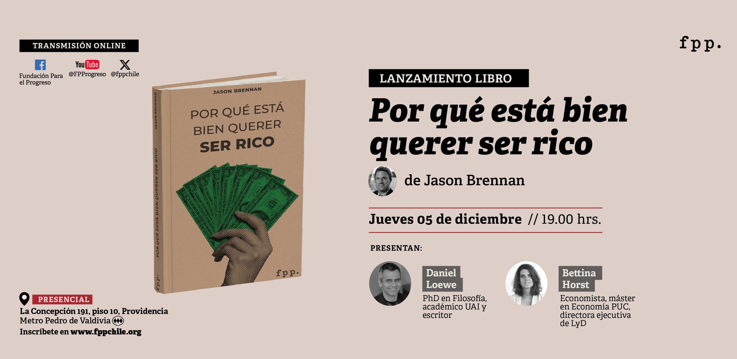 Fundación para el Progreso te invita al lanzamiento del nuevo libro de nuestra editorial Por qué está bien querer ser rico, obra del destacado filósofo, académico, profesor universitario y prolífico escritor estadounidense, Jason Brennan.