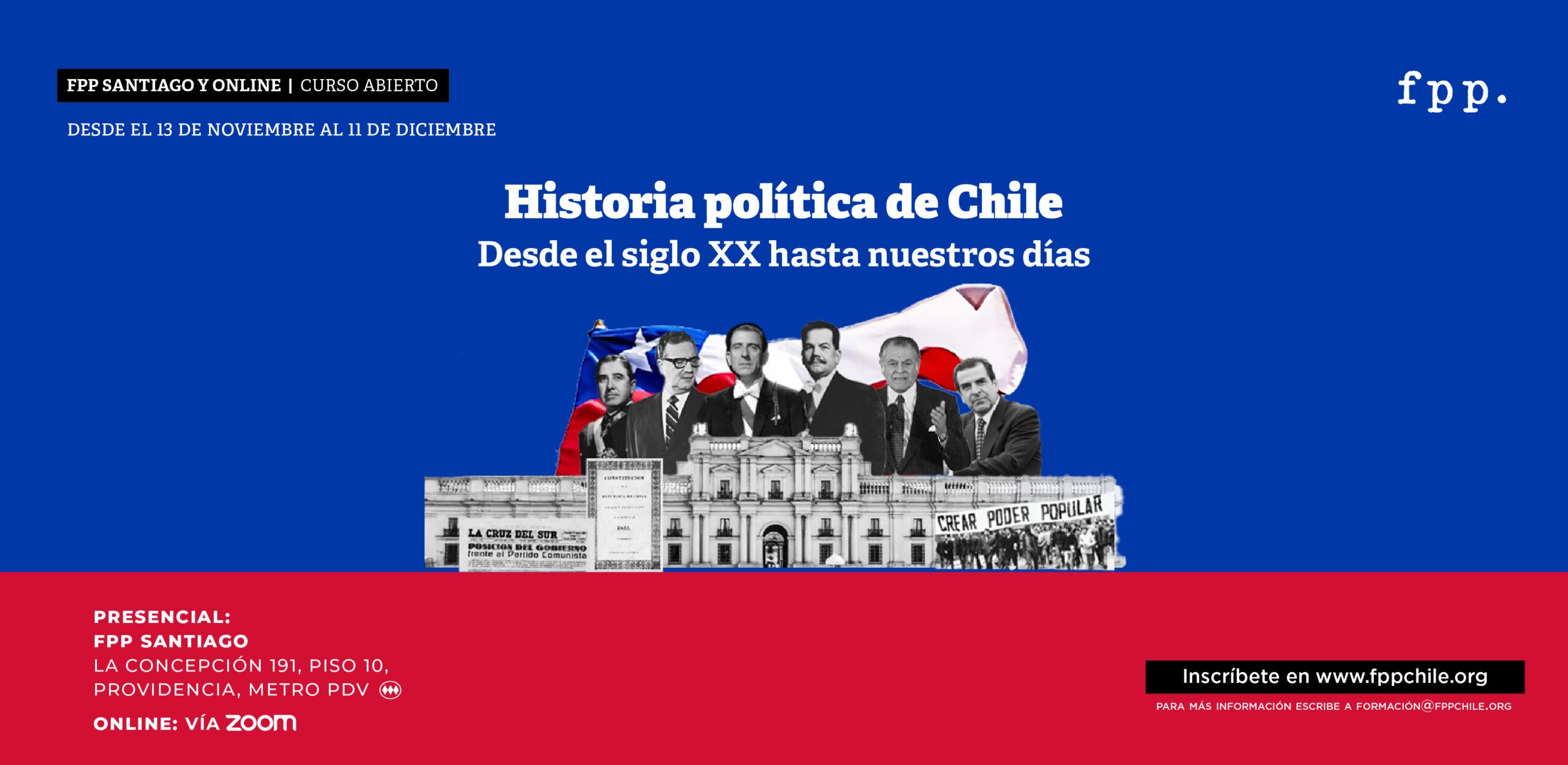 En el contexto de lo mencionado y la relevancia que alberga hoy en día la discusión sobre los acontecimientos políticos e institucionales que dieron forma al Chile de hoy, su cultura política, sus instituciones y tradiciones republicanas, la Fundación para el Progreso te invita al nuevo curso «Historia política de chile: desde el siglo XX hasta nuestros días».