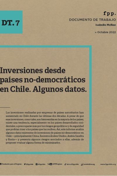 esas inversiones, como tales, son bienvenidas en la mayoría de los países, existe una tendencia, especialmente en los países desarrollados occidentales, a preocuparse más por los riesgos geopolíticos y de seguridad que podrían traer a los países que las reciben. Así, este informe analiza algunos datos existentes de inversiones de países no-democráticos en Chile —principalmente China, Emiratos Árabes Unidos, Arabia Saudita y Rusia— y presenta algunos riesgos asociados a ellas, además de proponer evaluar alguna forma de minimizarlos.