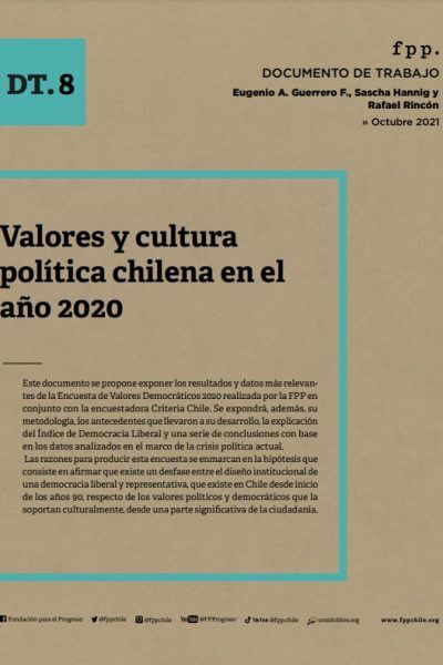 Este documento se propone exponer y comparar los resultados y datos más relevantes de la Encuesta de Valores Democráticos 2021 respecto de la encuesta realizada en el 2020 por la Fundación para el Progreso en conjunto con la encuestadora Criteria Research Chile. Con base en el primer informe analítico, se mostrarán la metodología de la encuesta, la evolución comparada de las principales temáticas, el Índice de Democracia Liberal y una serie de conclusiones con base en los datos analizados. Tal como se sostuvo en el primer informe esta encuesta se enmarca en la hipótesis que consiste en afirmar que existe un desfase entreel diseño institucional de una democracia liberal y representativa, la cual existe en Chile desde inicio de los años 90, respecto de los valores políticos y democráticos que la soportan culturalmente, desde una parte considerable de la ciudadanía.