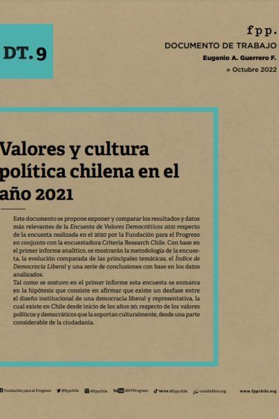 Este documento se propone exponer y comparar los resultados y datos más relevantes de la Encuesta de Valores Democráticos 2021 respecto de la encuesta realizada en el 2020 por la Fundación para el Progreso en conjunto con la encuestadora Criteria Research Chile. Con base en el primer informe analítico, se mostrarán la metodología de la encuesta, la evolución comparada de las principales temáticas, el Índice de Democracia Liberal y una serie de conclusiones con base en los datos analizados. Tal como se sostuvo en el primer informe esta encuesta se enmarca en la hipótesis que consiste en afirmar que existe un desfase entreel diseño institucional de una democracia liberal y representativa, la cual existe en Chile desde inicio de los años 90, respecto de los valores políticos y democráticos que la soportan culturalmente, desde una parte considerable de la ciudadanía.