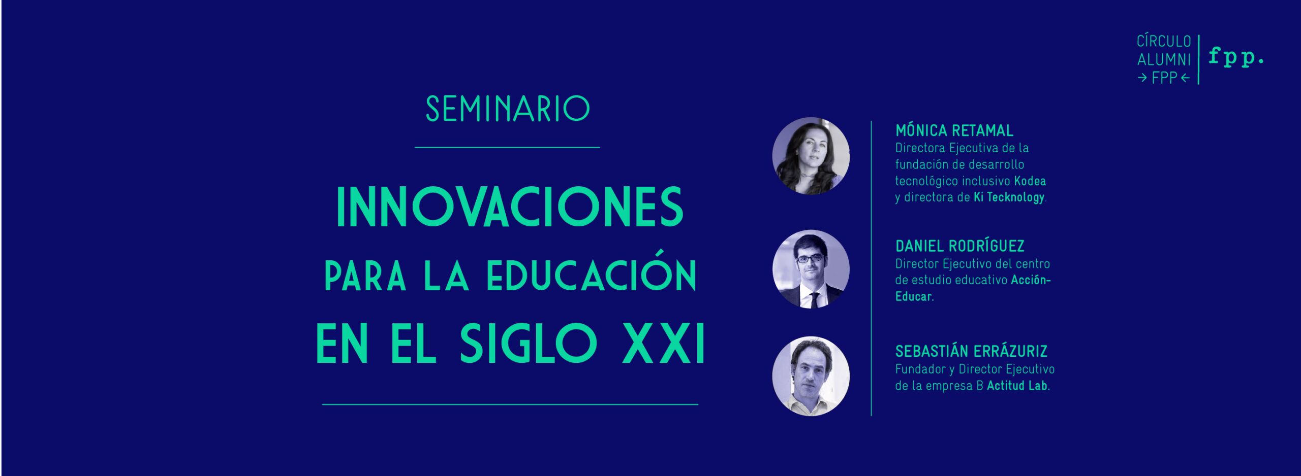 Seminario que aborda el panorama de la educación, el aprendizaje y las destrezas necesarias para el trabajo en el siglo XXI. Contará con la participación de los destacados: Mónica Retamal: Directora ejecutiva de la fundación de desarrollo tecnológico inclusivo Kodea y Directora de Ki Teknology, Sebastián Errázuriz: Fundador y Director ejecutivo de la empresa B Actitud Lab y Daniel Rodríguez: Director ejecutivo del centro de estudio educativo Acción Educar.