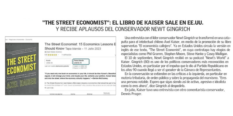 Publicado en El Mercurio, 19.09.2023 Una entrevista con el líder conservador Newt Gingrich se transformó en una catapulta para el intelectual chileno Axel Kaiser, en medio de la promoción de su libro superventas «El economista callejero». Ya en Estados Unidos circula la versión en inglés de ese texto, «The Street Economist», en cuya contratapa hay elogios de especialistas como Phil Gramm, Stephen Moore, Steve Hanke y Casey Mulligan.